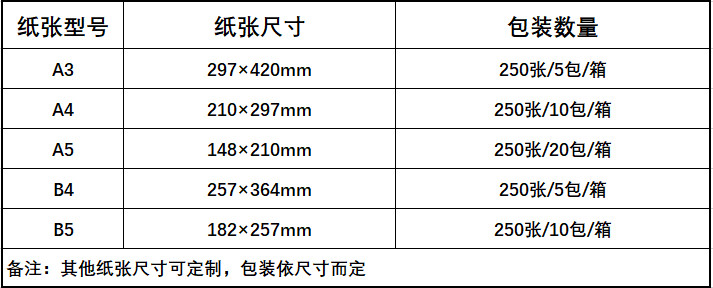 產(chǎn)品包裝:250張/包,10包/箱(A4包裝,其他包裝依據(jù)尺寸而定)