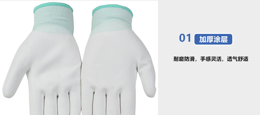 PU涂層手套又稱PU涂膠手套,根據(jù)涂膠的部位分為PU涂指手套、PU涂掌手套。其制作方法是在針織尼龍手套的手指或手掌部位涂上一層PU樹脂,這樣既增加了防滑性能,又增加了隔熱性能,同時能防止人體手掌的手汗和微粒污染,是精密電子生產(chǎn)線不可缺少的產(chǎn)品。可用于精工制造業(yè)、紡織業(yè)、電子行業(yè)、電力工程、汽車裝配、無塵車間等領域。