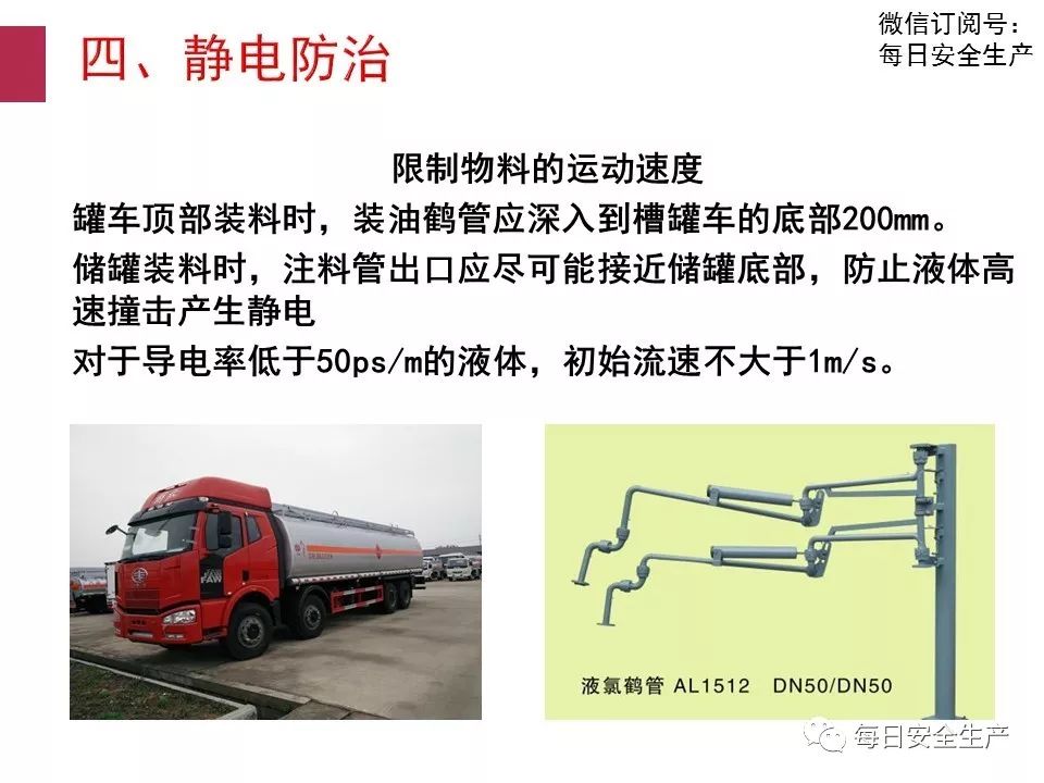 ④在輸油、裝油開始和裝油到容器的四分之三至結束時,容易發(fā)生靜電放電事故,這時應控制流速在1m/s以內(nèi)。