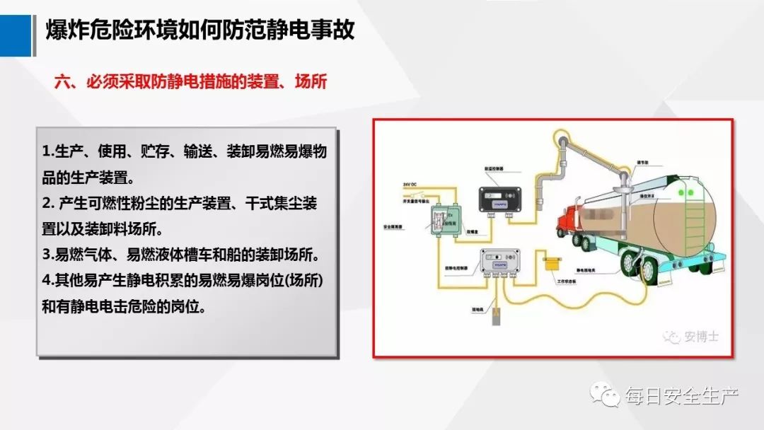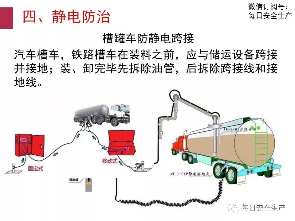 14.3.8 甲、乙和丙 A 類液體的汽車罐車或灌桶設施,應設置與罐車或桶跨接的防靜電接地裝置。