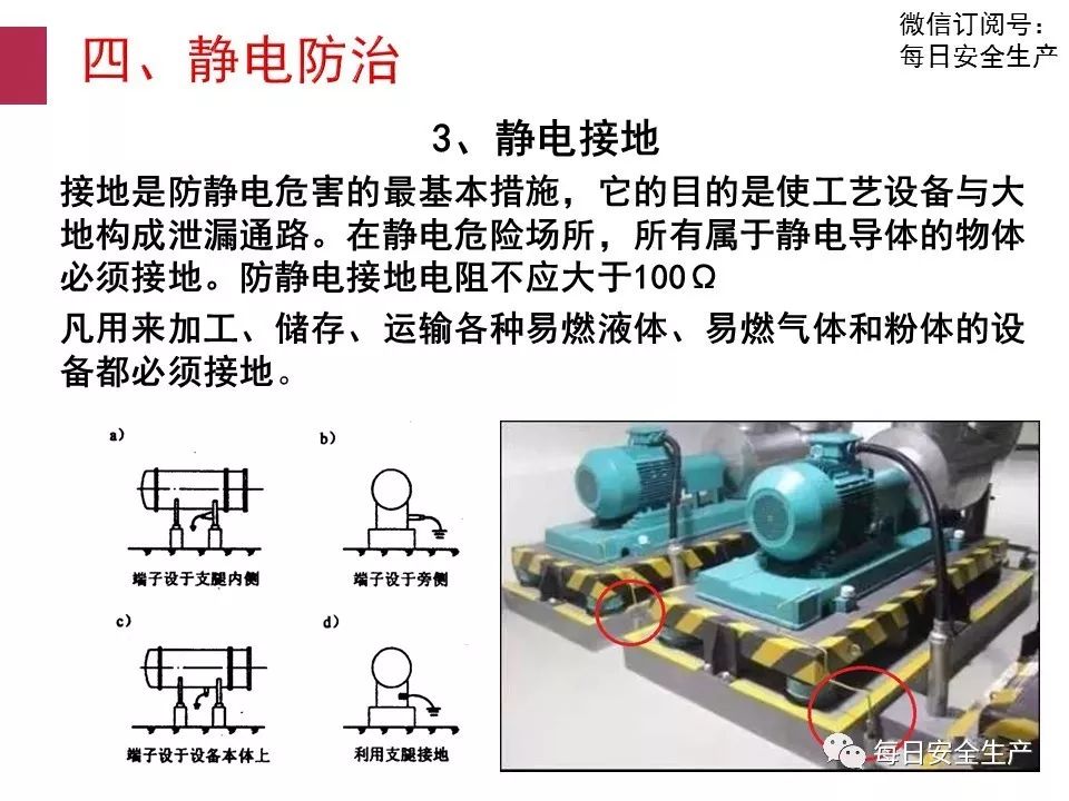 4.1.1 在生產(chǎn)加工、儲運過程中,設備、 管道、操作工具及人體等,有可能產(chǎn)生和積聚靜電而造成靜電危害時,應采取靜電接地措施。